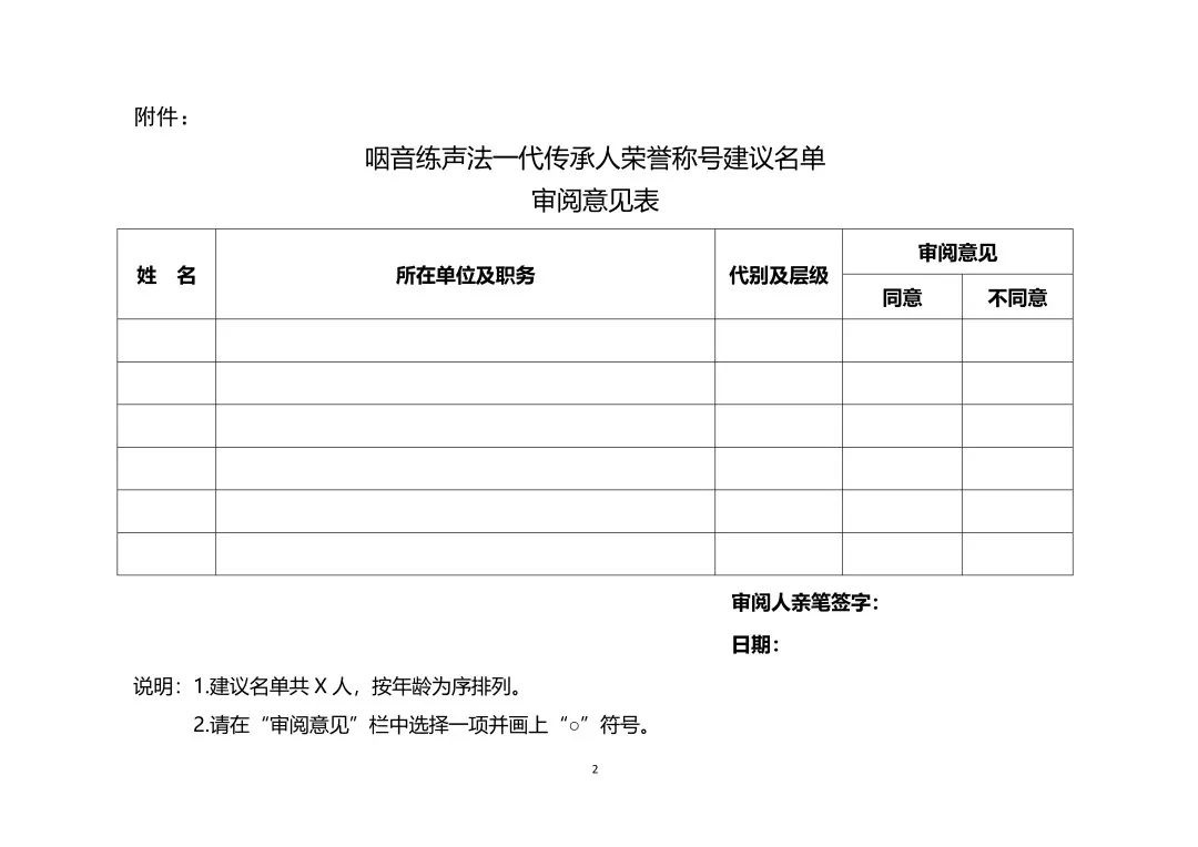 附件:咽音練聲法一代傳承人榮譽稱號建議名單審閱意見表